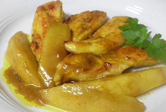 Pelar los mangos y cortar la pulpa en láminas.Una vez pasado el tiempo de asado de las pechugas, añadir las láminas de mango a la bandeja y untar con la mantequilla al curry. Subir el horno a 180ºC y cocer 15 minutos más, regándolo de vez en cuando con el jugo de la cocción.Servir los filetes de pechuga, acompañar con las láminas de mango y regar con la salsa.