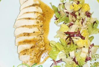 Salpimentar las pechugas y espolvorear con las hierbas provenzales. Dejar en la nevera al menos 30 minutos.
