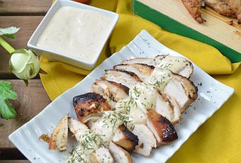 Servir cada pechuga cortada en trozos en un plato con la mayonesa por encima. Una receta sencilla con un sabor maravilloso, ese toque tostado que nos da el grill. Dentro de poco ya podemos hacer esta receta de la misma manera pero en la barbacoa. Nos quedará de lujo.