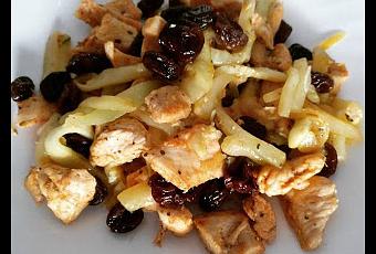 Cortar los calabacines en bastoncito y saltearlos junto con la cebolleta. Añadir la cáscara rallada de medio limón, las pasas y morearlo todo y pasados unos minutos agregar el pollo, cocer todo junto durante unos minutos y servir.