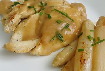 4. Servimos el pollo con los espárragos, napamos con salsa y espolvoreamos con cebollino picado.