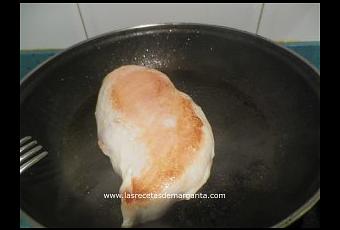 En una sartén, con un poco de aceite de oliva, doramos las pechugas, previamente salpimentadas y hacemos a la plancha por ambos lados.
