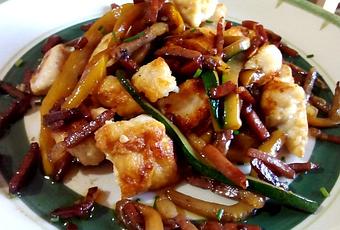 Cuando el jamón esté bien dorado, agregar pimientos y calabacín cortados ellos también en juliana.