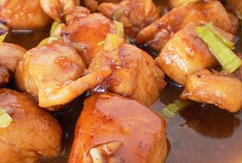 500 grms. de pechuga de pollo (cortada en trozos pequeños, el carnicero puede preparársela), una cucharada pequeña de jengibre en polvo, media cebolleta blanca pequeña (la parte blanca de una cebolleta), dos dientes de ajo, 3 cucharadas soperas de aceite de sésamo (se encuentran hoy en dia en cualquier supermercado), 6 cucharadas soperas de salsa de soja, el zumo de medio limón pequeño, media cucharada pequeña de tabasco, la parte verde de una cebolleta, 6 cucharadas soperas de mermelada de albarioque y 3 cucharadas soperas de aceite (uso de oliva).