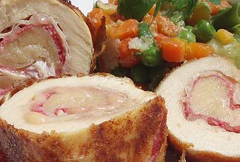 Cuando lo vayamos a preparar, ponemos la pechuga bien extendida sobre una bandeja, la escachamos un poco y le ponemos una loncha de jamón, una de queso, acabando con la de salchichón, enrollamos con cuidado y trabamos con uno o dos palillos.