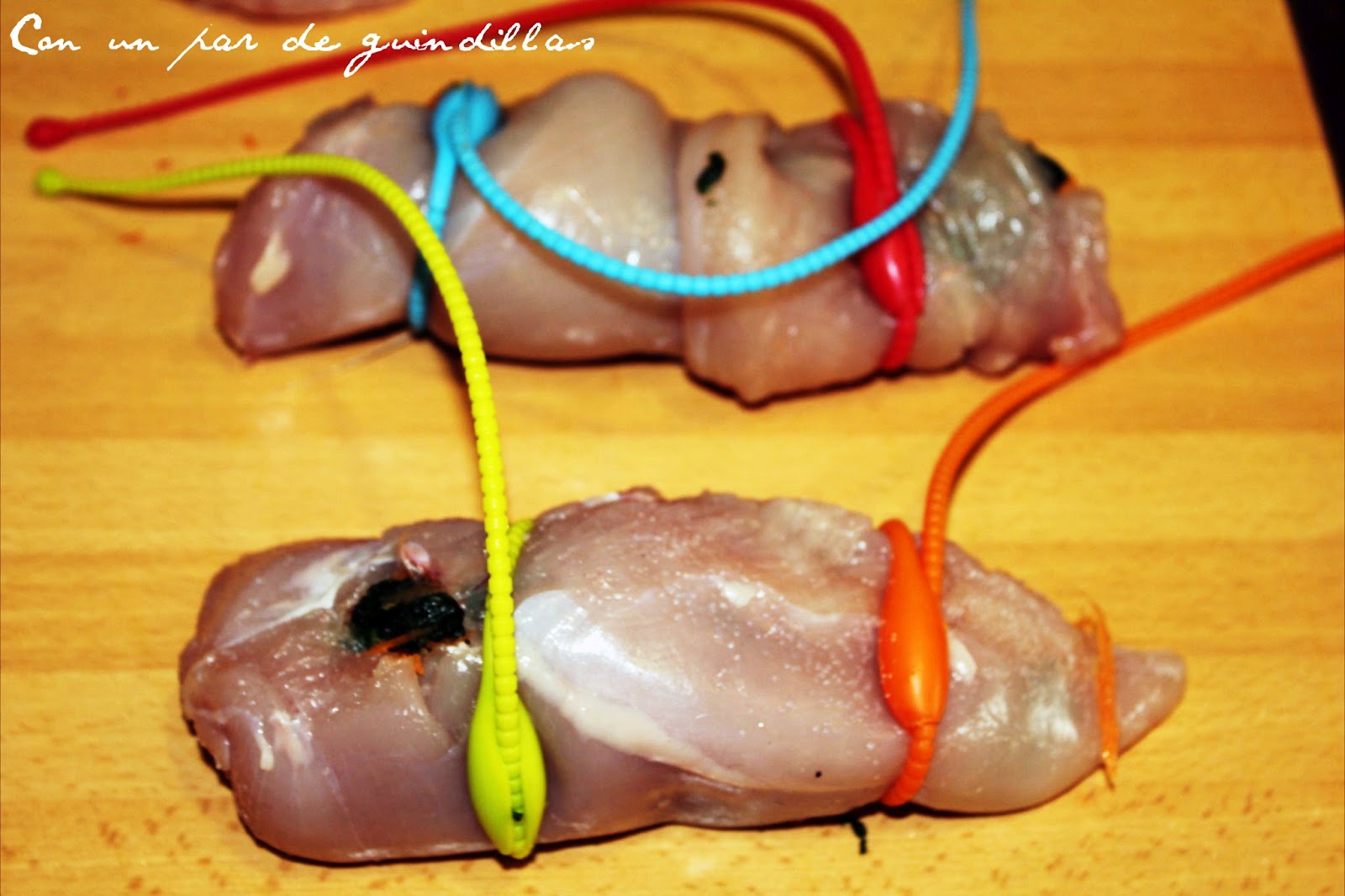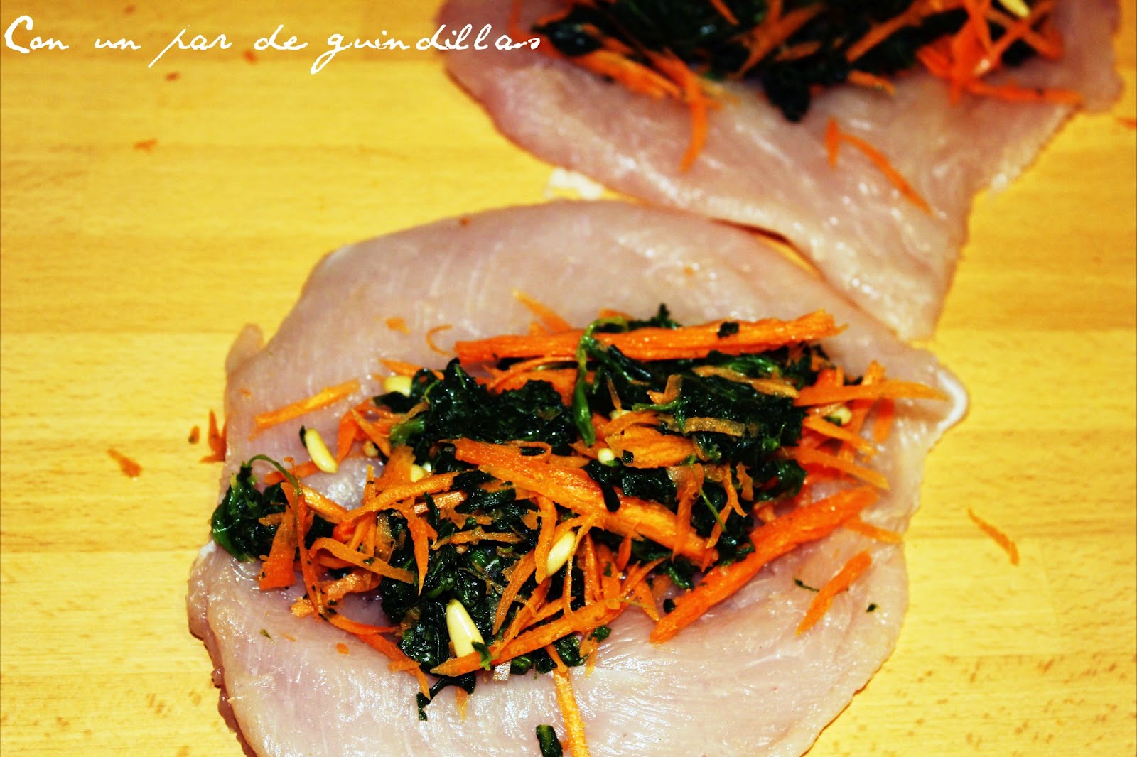 3.- Cocemos las espinacas y las salteamos con una cucharada de aceite, los piñones y las zanahorias cortadas en juliana. Rellenamos con esta mezcla las pechugas. Envolvemos hasta obtener un rollo y atamos con un hilo adecuado.