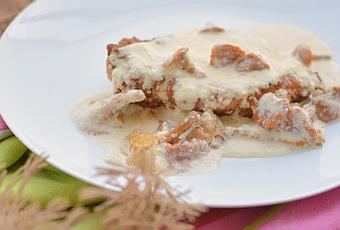 Limpiamos bien los rebozuelos y los añadimos a la salsa. Añadimos también las pechugas d pollo que teníamos reservadas y dejamos cocinar unos 10-15 minutitos a fuego suave.