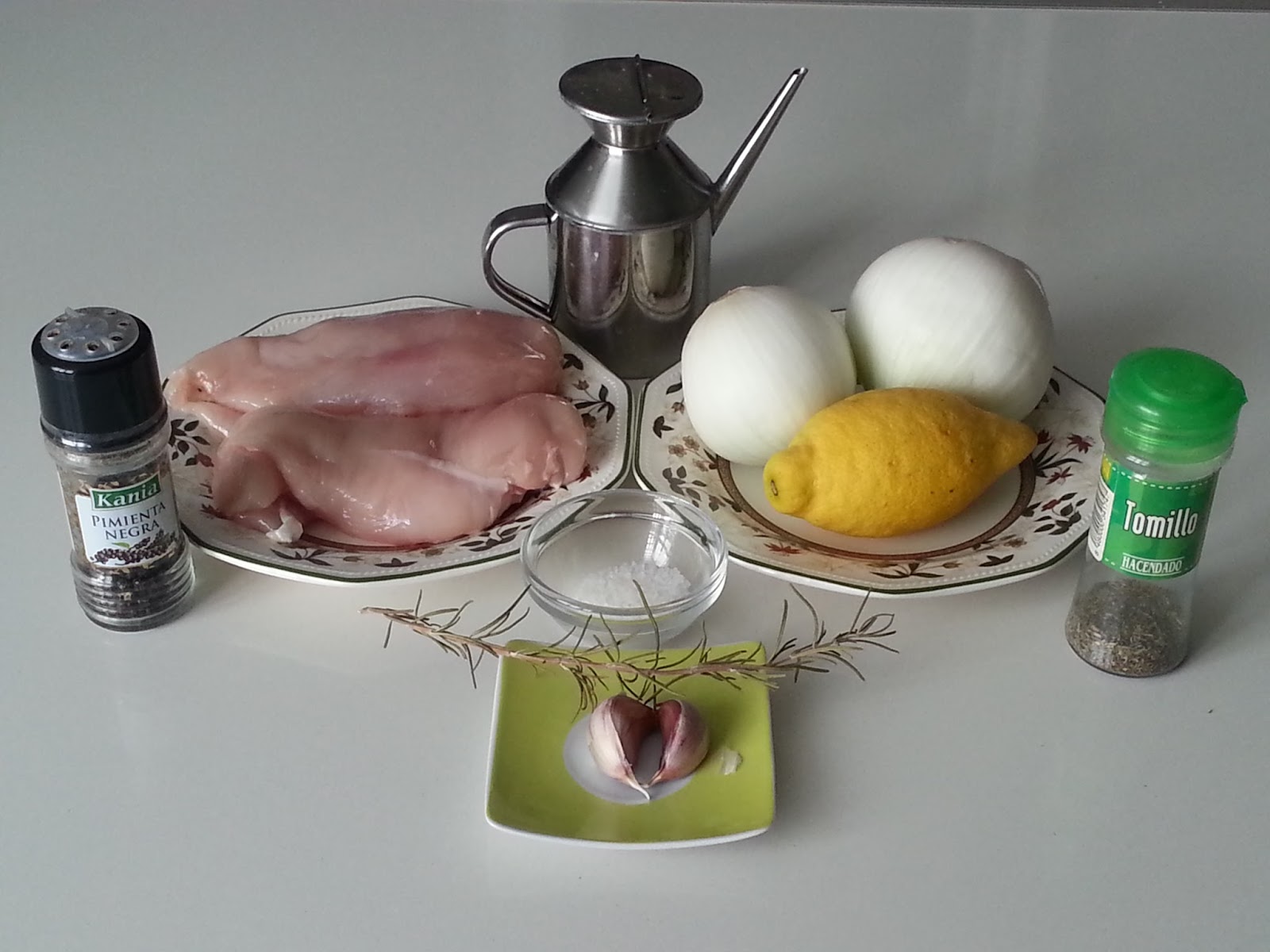 2 pechugas de pollo (500 gr aprox)2 cebollas (500 gr aprox)1 limón2 dientes de ajoUna cucharada de tomillo una ramita de romeroSalpimientaAceite