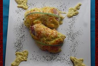 1-RELLENAR LA PECHUGAS, SALPIMENTADAS, CON UNA LONCHA DEJAMÓN Y QUESO, ENROLLAR Y CERRAR CON PALILLOS, COLOCAR EN EL VAROMA, Y RESERVAR.