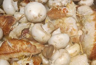 Cuando haya pochado unos 10-15 minutos, añadir champiñones y el vasito de vermut y dejar que hierva el conjunto unos 5 minutos más.