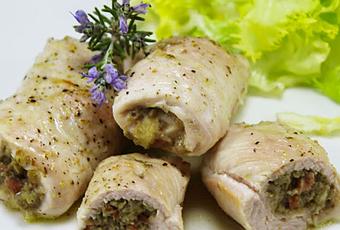 3- Espalmar los filetes de pavo un poco, para aplanarlos y salpimentar. En un extremo, poner una cucharada del relleno, hacer rollitos, e ir disponiéndolos en una fuente de horno engrasada. Rociar con un poco de aceite de oliva.