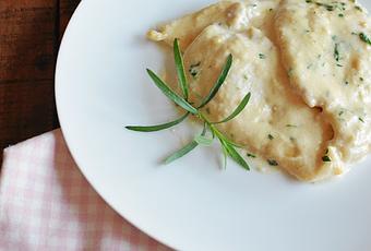 Añadimos de nuevo a la sartén las pechugas de pollo y la crema de nata y cebolla con ajito (si queréis que quede mas fino pasarlo por un colador chino). Movemos bien la sartén para que se reparta la salsa sobre las pechugas. Con una picadora o unas tijeras de cortar hierbas troceamos las ramitas de estragón fresco y añadimos a la salsa.