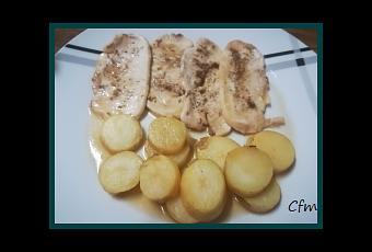-1 pechuga de pollo fileteadas-Sal-Pimienta-1 vaso de Fino-Miel-Romero-Aceite de oliva-3 ó 4 patatas cocidas (RECETA)-Cebolla