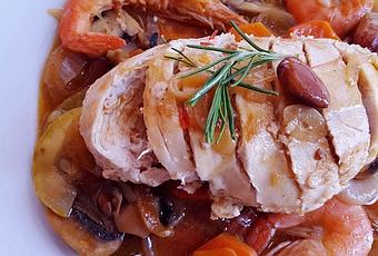 3.- Incorporamos unas cucharadas de salsa de soja, el azúcar moreno, la hoja de laurel y el ketchup. Cocinamos a fuego medio 5 minutos más. Introducimos las pechugas y dejamos que se cocinen 25 minutos, por ultimo añadimos las almendra y los langostinos.Cocinamos 10 minutos más. (Si es necesario vierte un vaso de agua sobre las verduras durante la cocción) Retiramos las pechugas con almendras y langostinos del fuego y servimos con la salsa y las verduras.
