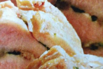 Unta las pechugas con la mezcla , enrollalas y ata con un hilo de cocina .