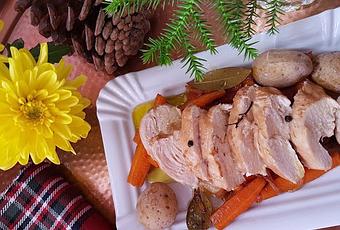 1.- Pelamos las zanahorias y las cebolla. Cortamos la cebolla en forma de juliana y la zanahoria en trozos medianos. En un caldero ponemos un poco de aceite de oliva, añadimos las verduras y los dientes de ajos con la piel. Pochamos las verduras 25 minutos a fuego medio, añadimos el tomillo, la hoja de laurel, la sal y las pimientas.2.- A continuación vertemos el vino, el vinagre y dejamos que todo se cocine unos minutos más. Mientras tanto; limpiamos las pechugas, le quitamos la grasa. Doramos las pechugas enteras en una sartén con un poco de aceite de oliva. Retiramos las pechugas y las ponemos en el caldero con el resto de las verduras, añadimos 1 vaso de agua. Cocemos la carne 6 o 7 minutos a fuego medio.Retiramos las pechugas en escabeche del fuego y servimos con una guarnición de papas arrugadas.
