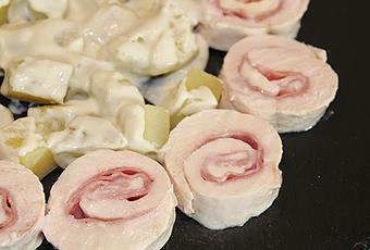 Esta receta que traigo hoy es un plato que como digo en el nombre del blog, es cocina fácil y elaborada, unas pechugas de pollo rellenas de jamón York y queso, además con unas patatas en salsa de nata y roquefort. Es una comida que puede servirse en frío o en caliente.