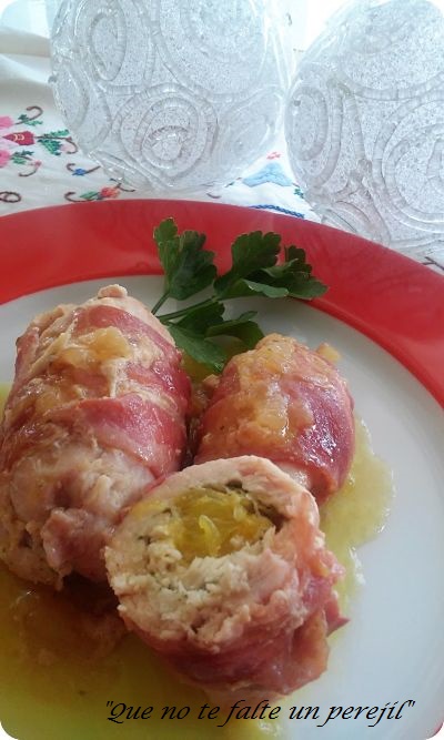 Envuelve cada rollito de pollo con una loncha de bacon. Átalos o como yo hice cierra con un palillo.