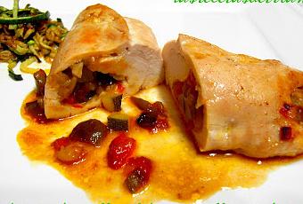 1.- Fileteamos las pechugas de pollo y salpimentamos, reservamos.2.- Picamos toda la verdura para el pisto y pochamos en aceite de oliva y una pizca de sal.3.- Cuando tengamos toda la verdura en su punto mezclamos con la salsa de tomate.4.- Damos un hervor al pisto de verduras.5.- Rectificamos de sal y dejamos reducir.6.- Sobre las pechugas de pollo, en su interior, ponemos el pisto y formamos un rollito, para cerrar nos ayudamos de un palillo de madera. Este proceso lo repetimos en las cuatro pechugas.7.- Colocamos sobre una bandeja de hornear y untamos de aceite de oliva.8.- Introducimos en el horno a 195 grados hasta que estén doradas.Un plato perfecto para que los mas pequeños coman verduras....
