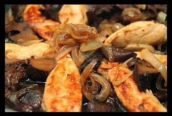 Una vez hecho, lo sacamos en un plato y hacemos a fuego alto las pechugas salpimentadas. Hechas a trozos, en mi caso alargados. Volvemos a introducir la fritada de rovellones y cebolla.
