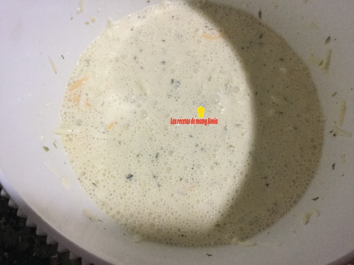 Seguidamente ponemos en un bol la nata, los huevos la sal y la pimienta, y con la ayuda de unas varillas batimos, incorporamos el orégano y el queso rallado y seguimos batiendo hasta que todo este bien integrado.