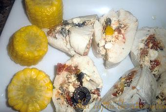 Cuando estén cocinadas las pechugas, las desenvolvemos con cuidado y las cortamos en rodajas. Servimos acompañadas de las mazorcas de maiz.
