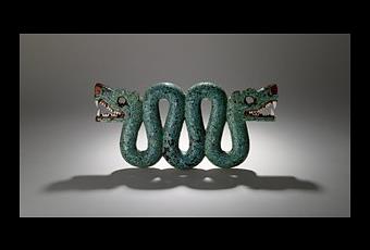 Pectoral, en forma de una serpiente de dos cabezas. Hecho de madera de cedro (Cedrela odorata) y cubierto con mosaico hecho de turquesa y concha de ostra espinosa roja (Spondylus princeps). Los dientes en las dos bocas abiertas están hechos de concha de caracol (Strombus). Se utilizan dos resinas como adhesivo: resina de pino y resina de Bursera (copal). En la boca, la resina se tiñe de rojo con hematita. El adhesivo de cera de abejas sobrevive alrededor de las cuencas oculares. LEER MÁS »