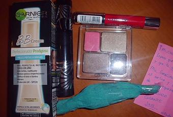¡Hola! He recibido un regalazo de la parte de Pedacitos de Mi. He recibido una BB de Garnier, una máscara de pestañas, un balsamo con color, una paletita de sombras, un esmalte y una nota de su parte. Muchas gracias.