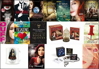 Ejemplar de bolsillo de Amos y mazmorras 1. Ejemplar Beautiful bastard. Ejemplar de bolsillo de Cazadores de sombras: ciudad de hueso. Ejemplar de El encanto de cuervo. Ejemplar de Percy Jackson, el ladrón del rayo. Ejemplar Firelight. Ejemplar de bolsillo Hermosas Criaturas. Ejemplar The Duff. Ejemplar Pulsaciones. Ejemplar libro de citas de Cazadores de Sombras (en inglés). Merchandising Harry Potter: Hedwig la lechuza. Ejemplar Paper towns. Taza Cazadores de sombras. Ejemplar Never cry werewolf (en inglés). Kit merchandising cazadores de sombras (incluye collar, mini tatuajes, imanes y un librito con imágenes de la película). Ejemplar de bolsillo Bajo la misma estrella.