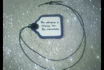 El colgante está realizado con arcilla polimérica, blanca, azul y negra, y tiene una inscripción pintada a mano. También tiene un cordón negro el cual se puede regular y hacer el colgante más corto o más largo.