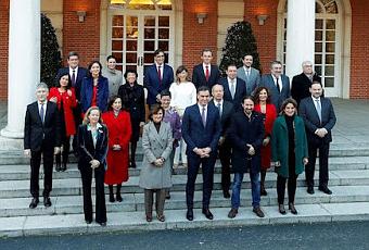 Pedro Sánchez, posa con su nuevo gabinete de ministros en el Palacio de la Moncloa antes del primer Consejo de Ministros.A primera hora de la mañana del pasado lunes, las diferentes televisiones y las radios ofrecieron el desfile de los responsables del Gobierno con sus respectivas carteras. Tanto Pablo Iglesias como Alberto Garzón, líder de Izquierda Unida y procedente del Partido Comunista, no llevaban corbata. Y lucían en sus chaquetas el pin del triángulo rojo invertido, marca que se usaba para identificar a los comunistas presos en campos de concentración nazis. José Luis Ábalos, ministro de Transportes y número tres del PSOE, lucía uno con una bandera de España. El acto duró unos 20 minutos. Tras la lectura de los juramentos —la única vez que nadie juró realmente, sino que “prometieron”—, todos saludaron personalmente al Rey con un apretón de manos, sonriendo, al igual que el monarca, evitando comentarios y especulaciones sobre simpatías y posibles antipatías con algunos de ellos. Luego, el presidente del Gobierno se puso a disposición de la prensa, compareciendo durante algo más de 40 minutos respondiendo a distintas cuestiones.