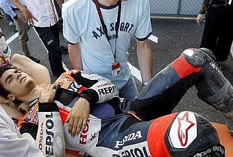 "La caída ha sido muy extraña. No estaba tirando, pero ha ido a cortar el gas y parece ser que el clave se ha quedado enganchado. No sabemos muy bien lo que ha pasado. Ha cortado gas y la moto no paraba. Se le ha movido y ha hecho un extraño de atrás. Estaba llegando a la curva, ha intentado reducir, pero la moto no paraba. Al final, se ha ido recto y se ha caído, con la mala fortuna de que la clavícula izquierda ha pegado contra el asfalto y se le ha roto", explicó Alberto Puig, 'team manager' de Pedrosa, que también se ha dado un golpe en el maleolo izquierdo. "Afortunadamente, ahí no tiene ningún problema", señaló Puig.
