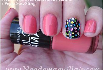 En esta foto por ejemplo llevo una uña con pegatina Bling de base negra con piedrecitas Swarovski variadas sobre un esmaltado en tono coral, en concreto el color Coral Craze de los esmaltes Colorama de Maybelline (os hablé de ellos aquí)