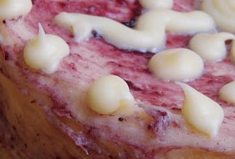 Montamos el pastel. Ponemos de base una placa de bizcocho, untamos dos cucharadas de mermelada de arándanos y encima otra placa de bizcocho, de nuevo mermelada y terminamos con el último bizcocho. Cubrimos el pastel con la crema de mantequilla, como os he dicho me quedé un poco corta y la próxima vez doblaré la cantidad. He restregado un poco de mermelada tumben por encima y con la crema de leche y chocolate que tenemos en la manga decoramos al gusto.