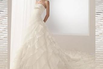 Buenas tardes. Necesito ayuda con una elección importante. Mi vestido de novia es palabra de honor, con drapeados, y de la cadera izquierda empiezan a salir volantes hasta llegar a la cola. Llevaré una mantilla a modo de "bolero", recogidas "en mariposa" en la espalda. El vestido se encuentra en estas direcciones web: http://blog.webboda.es/modelo-Bristol-aire-collection-2010/ y http://www.hispabodas.com/articulos/rosa-clara/fotos/5102. No llevaré el adorno de bisutería bajo el pecho. Mi pelo es castaño oscuro y fosco, asi que podría rizarlo o alisarlo. Soy más bien pálida, y no llevaré velo. No soy atlética, y tengo la talla 42 (lo digo para que tenga en cuenta en el volumen del vestido). Mido alrededor del 1,70. La boda será en a principios de septiembre, por la tarde. Mi novio mide 2 metros, así que un moño altísimo no sería descartable, aunque no me agrada mucho la idea. El moño estilo bailarina que lleva la modelo de las fotografías no me gusta: me recuerda al tapón de alguna botella de colonia. Muchas gracias por la ayuda: cualquier orientación será bien recibida (estoy muy confusa en este tema).Hola. Con tu altura, más los tacones, no debes preocuparte mucho por la altura de tu novio. No dices tu edad ni el largo de tu pelo, ni si tu cuello es corto o largo, ni cómo es el óvalo de tu cara, ni cómo serán los pendientes y/o collar si piensas usarlo. Estos datos son importantes a la hora de elegir un peinado, y decidir si usarás algún tipo de tocado. Pensando en que probablemente seas joven, y el largo de tu pelo permita un recogido, e independienteme de lo anterior, el estilo del vestido pide compensar el palabra de honor y el gran armado de la falda. Yo elegiría un recogido natural, con poca caída, y algo ahuecado. No obstante, te aconsejo que, con un top con ese tipo de escote, vayas a la peluquería y te pruebes distintos peinados, pues tienes tiempo de aquí a septiembre. Así, también podrás pensar, probar y elegir el tipo de tocado que mejor vaya al conjunto del vestido, teniendo en cuenta que si te decides por flores, sean del mismo tipo (mucho más pequeñas, claro) que las que lleves en el ramo, en cuya forma y composición también has de pensar, pues tantos volantes han de tenerse en cuenta a la hora de elaborar el conjunto total de tu atuendo.Saludos, y enhorabuena por tu boda.