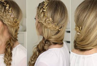 Este peinado es ideal para una novia boho, se trata de una trenza francesa a lo largo del lateral izquierdo y que se une con una trenza de espiga que va hacia el mismo lado decorada con una diademas de hojitas doradas, el resultado es precioso♥