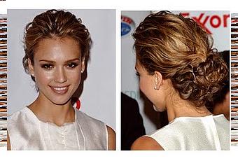 Después de lavarte el pelo, sécalo con un secador con difusor para adquirir volumen. Una vez esté seco, aplica un spray especial para proteger el pelo del calor de la plancha que vas a usar a continuación (así te quedará con mucho más brillo, y con un aspecto más saludable). Coge la plancha de pelo, y toma pequeños mechones, después gira la plancha media vuelta y deslízalo lentamente. Quedará una suave onda. Echa el cabello hacia tras y haz una trenza floja. Enrosca y sujeta con horquillas de moño a la altura de la nuca.