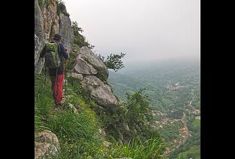 Cruzaremos la canal en horizontal dirigiéndonos a un impresionante farallón rocoso, donde se encuentran varias vías de escalada y ya por marcados tornos descendemos hacia la parte inferior de la vertical pared.