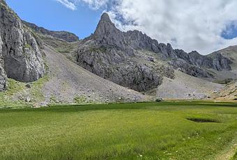 🗻 A su derecha se eleva con fuerza la Aguja de Las Coloradas, una formación caliza que cierra el circo de manera espectacular y le da carácter a este enclave de alta montaña.
