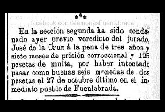 Una persona llamada José de la Cruz tuvo el veredicto de la pena de tres años y siete meses de prisión correccional y 125 pesetas de multa, por haber intentado pasar como buenas seis monedas de dos pesetas el 27 de octubre de 1895 en Fuenlabrada.