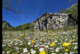 Abandonamos el hayedo y alcanzamos las cabañas de Manín Cimero o de Arriba (1.240 m.)