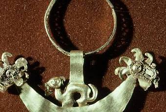 En las tumbas de la cultura mochica se han encontrado delicados objetos de cerámica y orfebrería. Como por ejemplo, este pendiente tan bonito, que representa una figura con dos cabezas de pájaro y un cuerpo de felino.