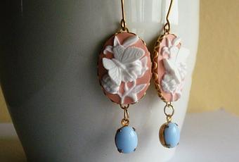 Delicados pendientes realizados con camafeos rosa con detalles de mariposa.