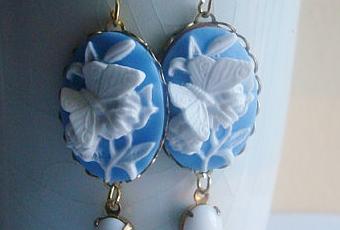 Delicados pendientes realizados con camafeos azules con detalles de mariposa. Están montados sobre filigranas doradas y lleva aplicación de cristal blanco.Llévalos con tus pendientes butterfly.Medidas del camafeo, 25 x 18 mmPrecio, 12 euros + gastos de envío.Puedes comprarlos en la tienda online pinchandoaquí