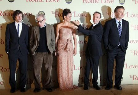 Jesse Eisenberg, Woody Allen, Penelope Cruz, Roberto Benigni and Alec Baldwin attend the 'To Rome With Love' World Premiere at Auditoriun Parco Della Musica on April 13, 2012 in Rome, Italy.