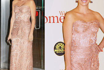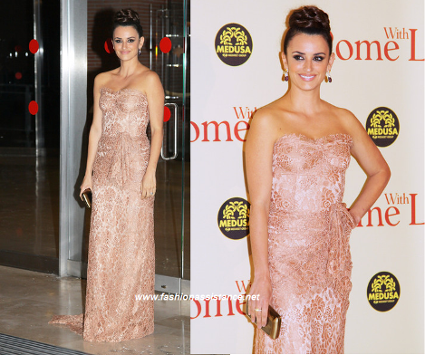 La actriz volvió a lucir un modelo de un diseñador italiano, (recordemos que para la presentación a la prensa Pe eligió un little black dress de Pucci), y estaba espléndida con un vestido de encaje de escote corazón, en rosa empolvado, con un drapeado y lazada en la cintura y un poco de cola, de Dolce & Gabanna, que combinó con un clutch en bronce.