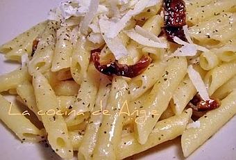 - Poner a calentar 2 cuch. de aceite de oliva y dorar en él 8-10 tomates secos cortados en tiras no muy finas; cuando lleve unos minutos, añadir 2 dientes de ajo picados o laminados. Añadir 125 ml. de leche y 250 grs. de queso mascarpone. Remover hasta que el mascarpone se haya derretido. Salpimentar y añadir albahaca fresca picada. Añadir el líquido reservado y la pasta, remover y servir con queso parmesano recién rallado.