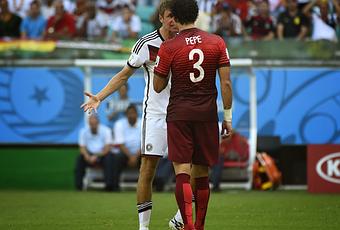 Goles que han venido en tres ocasiones por parte de Thomas Müller. Si todos hemos jugador alguna vez contra un rival 'intenso' hasta molestar, ¿cuántas veces no has jugado con un jugador que siempre te ofrecía una solución cuando te veías agobiado? Levantando la mano con la discreción justa para que le veas y descargar hacía él la pelota, haciéndote quedar como un gran pasador con visión y negándole el mérito de haber visto el espacio y dibujado la línea del pase. El jugador del partido por el premio que le ha dado la FIFA por sus tres goles, que es la parte tierna del asunto, y por haber sido responsable (voluntariamente o no) de la enésima cruzada de cables de Pepe. El 13 del Bayern es un jugador especial: no es un prodigio técnico ni estético pero hace casi todo bien: juega con alto rendimiento en cualquier zona del campo contrario, interpreta el juego sin balón como pocos en el mundo y se entiende en el juego como parte de un todo, siendo generoso en el esfuerzo. Con unas virtudes de tan poco lucimiento es curioso que lleve, a esta hora, el doble de goles en fases finales de Mundiales (8) que Messi y Cristiano Ronaldo juntos (2 por cabeza), por hablar de dos superestrellas de esto que poco o nada tengan que ver en su estilo con el jugador alemán.