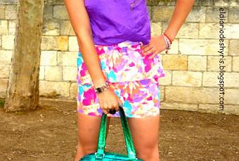 La falda es de lefties, de esta temporada. Todo lo demás de temporadas pasadas, la camiseta, archiconocida, de zara; las cuñas de blanco, el bolso de lollipops y el reloj d D&G.