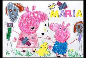 Así que nos apuntamos, y digo que nos apuntamos porque era tarea de las dos, de madre e hija, ya que tenía que ver con el día de la madre. El concurso se basaba en Peppa Pig y sus amiguitos y nosotras. Yo tenía que ayudarla un poquito, más que ayudarla era participar, y demostrar mi participación con una foto de las 2 juntas, haciendo el dibujo.Mi hija dibujó a Peppa y George junto a nosotras jugando en el campo.